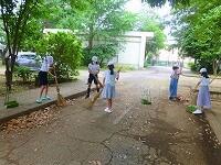 曇り空の月曜の朝です。美化委員会の児童が落ち葉を掃いています。体育委員会は,校庭で安全に遊べるように,低中高学年の遊び場所を分けるコーンを設置しています。3年生は花壇と鉢に水やりをしています。