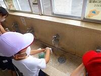 新型コロナウイルス感染症対策もすっかり定着し,学校の中で「換気」「マスクの着用」「手洗い」は生活の一部になっています。1年生も,体育の後は石けんでしっかり手洗いをしています。待っている子も,きちんと距離をとっていますよ。