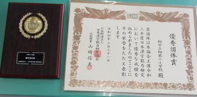 このたび昨年度の「日本漢字能力検定」の優秀団体賞をいただきました。昨年度,多くの子どもたちが自身の力を試すためにチャレンジした証です。本年度は,11月4日(金)に実施予定です。