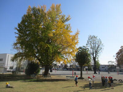 24日(金)まで緑色だった,校庭の「いちょう」の葉は,一気に黄金色になりました。短い季節の変わり目ですが,子ども達も葉の色づきを楽しんでいます。