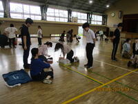 翌日は,福祉協議会からお借りした備品を使って,「高齢者疑似体験」を実施しました。子供たちは「おもり」などの備品を身に付けると,「体が重い」「動きづらい」「これじゃ走れない」など,感想を漏らしていました。実感したことによって,どのように高齢者の方々と接すればよいか,いろいろと考えをめぐらせていました。