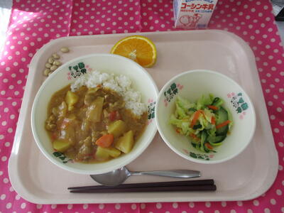 今日の給食のデザートはスイートスプリングという柑橘です。スイートスプリングは温州みかんと八朔を掛け合わせた柑橘で爽やかな甘みと香りが特徴です。皮の色が収穫時期によって緑色から黄色、そしてオレンジ色に変化します。今日のスイートスプリングの皮の色は緑色から黄色が多いかと思います。見た目はすっぱそうですが,酸味は少ないので食べてみてください。
