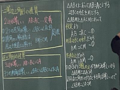 イメージがありますが、三角形の定理の証明を学ぶ2年生の黒板には