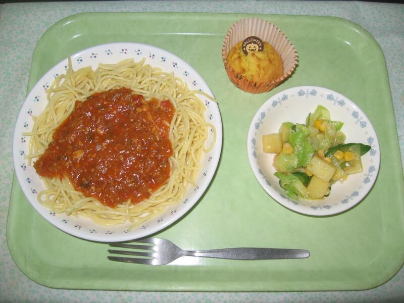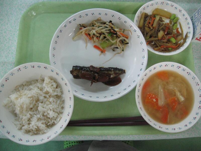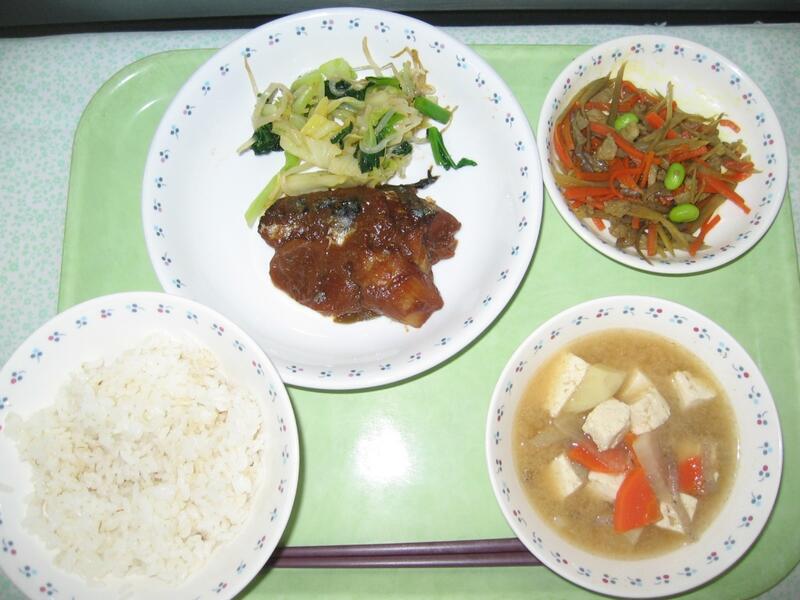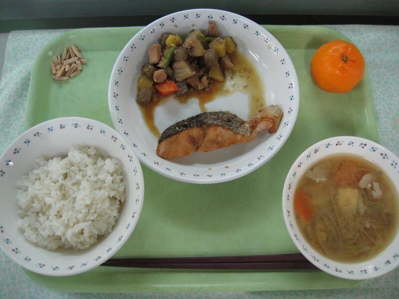 昨日とうってかわり、今日は和食!という感じの和食です。主菜はさんまの甘露煮です。旬のものをたくさん味わってほしいので、今月は特にさんまを多めにだしています。今日はさんまを甘じょっぱく煮込みました。隠し味はオレンジピューレが入っていることです。魚にオレンジ!?と思う人もいるかと思いますが、オレンジの風味は残らず、かわりに魚の臭みをとってくれます。ほろほろにやわらかくなっていて、臭みも少ないので、ぜひ食べてくださいね。