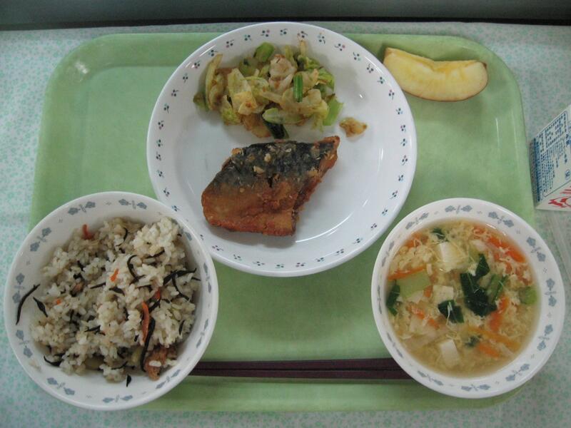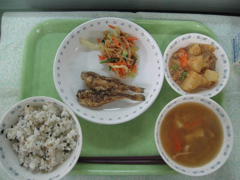 今日は和食です。主食は秋刀魚御飯です。旬な秋刀魚をカラッと油で揚げ、あまじょっぱいタレに絡め、それを御飯にさっくりと混ぜ合わせました。白い御飯も秋刀魚が合わさることで食べやすいかと思います。