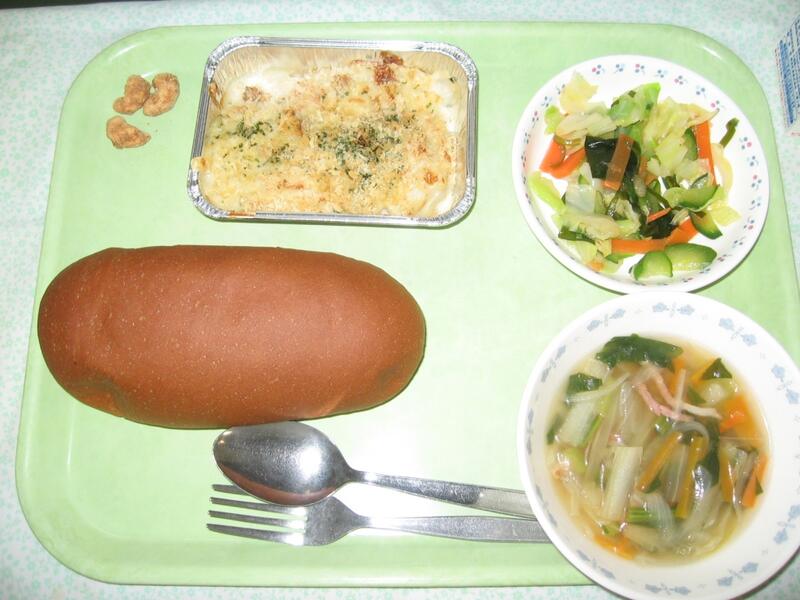 さて、今日の献立は洋食です。主食はフィッシュバーガーです。フィッシュバーガーはセルフで、キャベツとフィッシュポーションを挟み、ソースをかけて食べるようになっています。丸パンのみだと食べにくいですが、はさむとパンも食べやすくなるかなと思います。