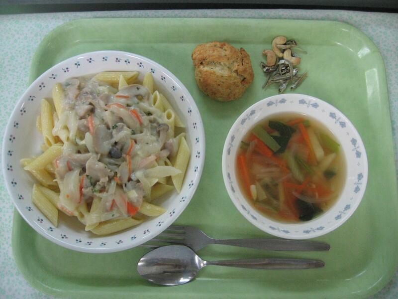 今日の献立は洋食です。主食は秋のクリームペンネです。普段のスパゲティはトマト系のミートソースですが、寒くなってくると食べたくなるのが濃厚なクリーム系です。ちなみに秋のクリームペンネの「秋」というのは、旬のしめじがたくさん入っているからです。トマト系よりもクリームソースはしめじが入っていても食べやすいので、きのこ類が苦手な人も1口でもいいのでチャレンジしてくれたらと思います。