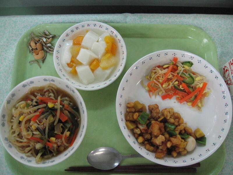 今日の献立は中華です。主食は中華丼です。中華丼は、ご飯に八宝菜をかけた日本発祥の料理です。中華料理店のまかないが発祥、という説があります。そのため、中国には中華丼という料理はないそうです。今日の中華丼は、えび、いか、豚肉、たまねぎ、チンゲン菜、ねぎ、にんじん、たけのこ、うずらなど具だくさんのあんをつくりました。えび・いか・豚肉には体をつくるたんぱく質、たまねぎなど野菜類には様々なビタミンなどが含まれています。