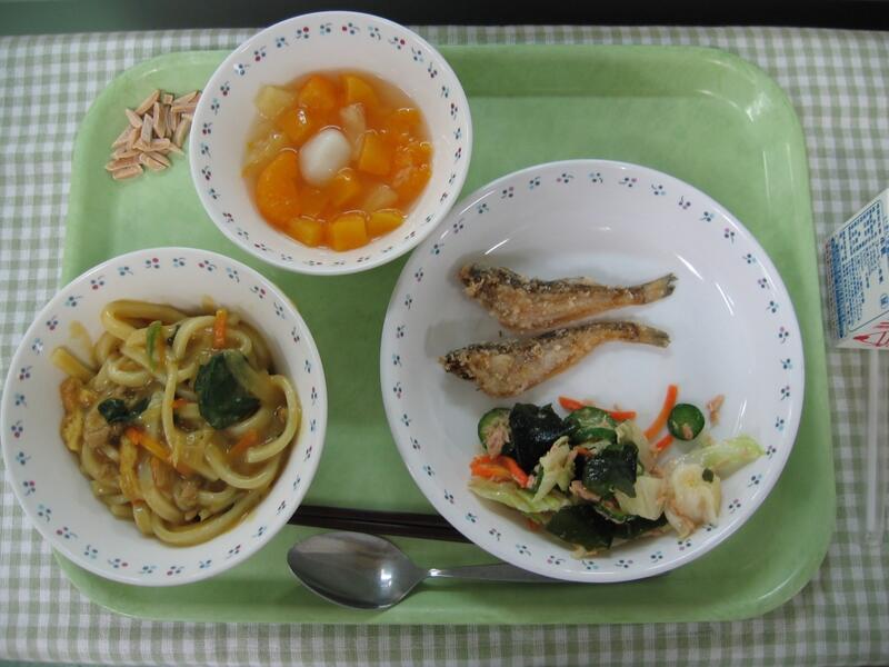今日の給食は、和食です。主食はカレーうどんです。豚肉、油揚げ、玉ねぎ、にんじん、ねぎ、ほうれん草と具だくさんになっています。先に濃いめにカレーを作ってから、そこへ別でゆでたうどんを加えて、さらに煮込みました。カレー風味で、スパイシーで、食欲を誘います。ぜひもりもり食べてほしいです。