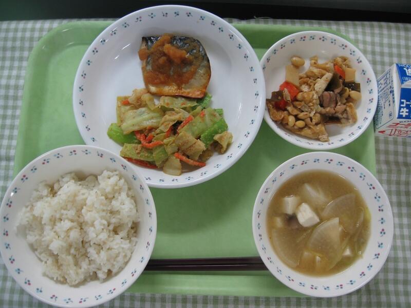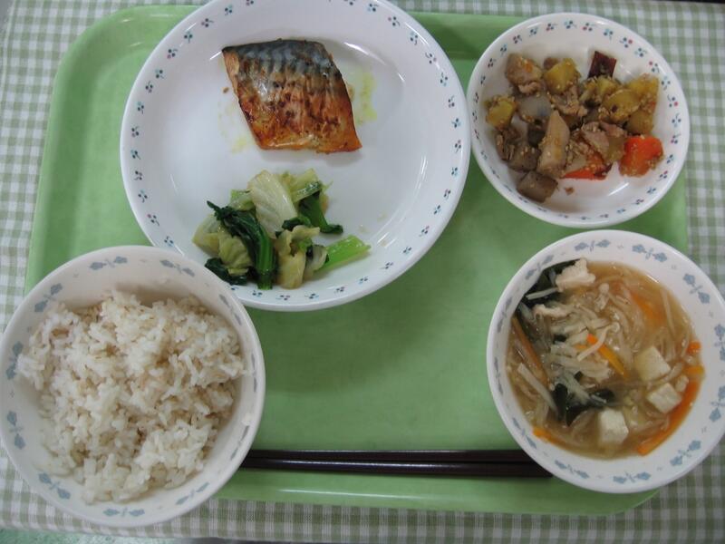 今日の給食は和食です。主菜は鯖のカレー焼きです。脳を活性化するDHAなどが含まれている鯖をカレー粉、すり下ろした玉ねぎ、しょうゆ、みりんなどでしっかりめに味つけしました。カレー粉がきいてるいるため、くさみもなく、美味しく鯖が食べられます。白ご飯に合う1品ですので、しっかりご飯をよそって一緒に食べてほしいです。
