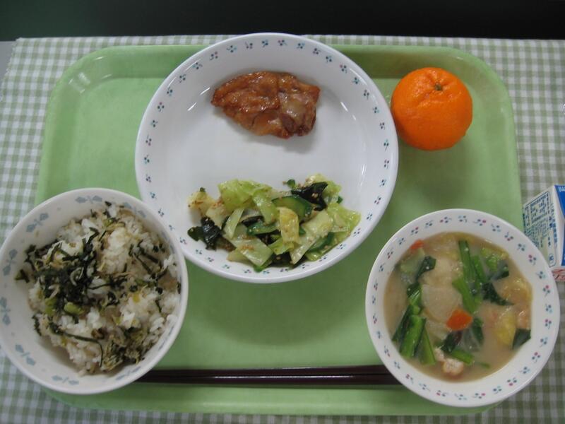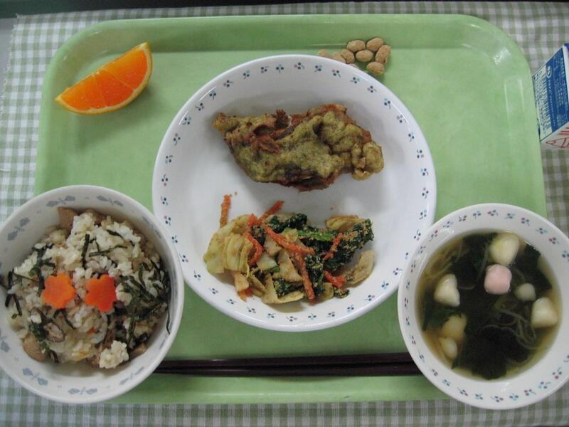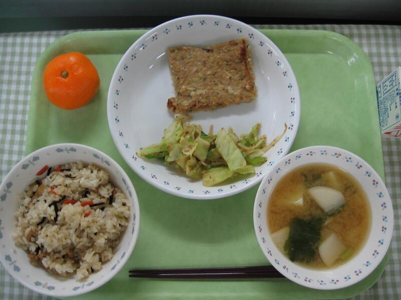 今日の給食は、和食です。主食はたこ飯です。その名の通り、たこをご飯に混ぜ合わせて、のりをかけたご飯です。しょうがを使って調理しているため、たこのくさみはほとんどありません。そして、主菜はメルルーサの味噌マヨ焼きです。淡白な味のメルルーサですが、味噌マヨをかけることで、味がしっかりし、美味しく焼きあがりました。魚のまわりの味噌マヨが焦げやすかったのですが、魚は焦げずにしっとりふっくら焼きあがってよかったです。子供たちも魚ですが、しっかり食べてくれていました。