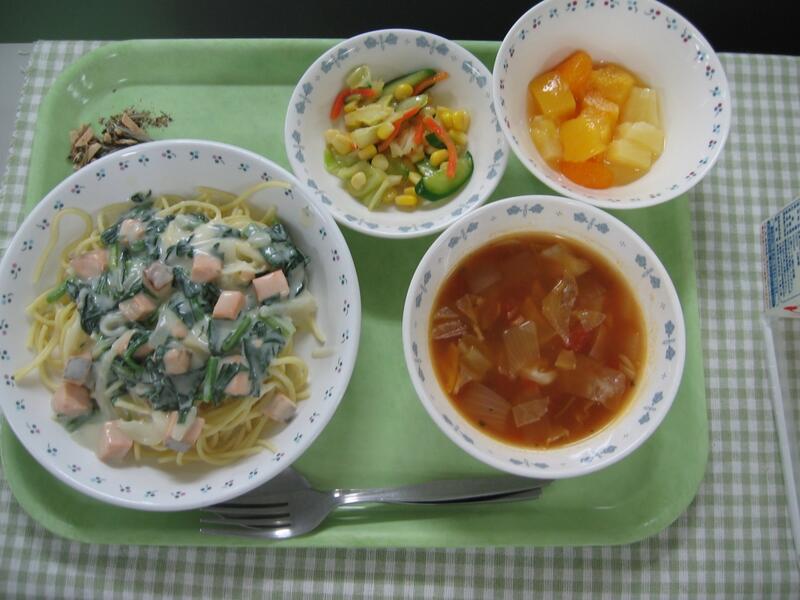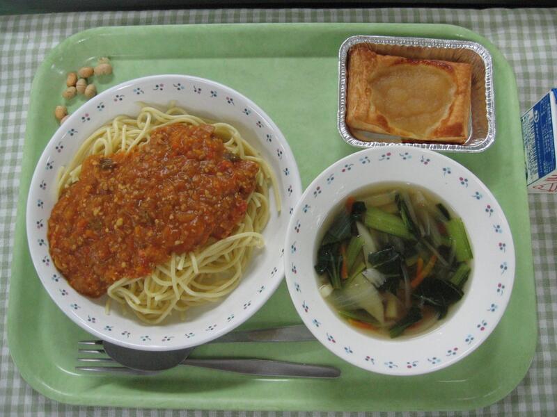 今日の献立は、洋食です。主食はスパゲティミートソースです。ミートソースは一見作るのが簡単そうに見えるかと思いますが、玉ねぎ、にんじん、ピーマン、にんにく、マッシュルームなどたくさん具材を切って、加えて、トマトやケチャップの酸味がとぶように、1時間程度よーく煮込んで作っています。麺をしっかりよそって、ミートソースをかけ、しっかり食べてくれたらと思います。