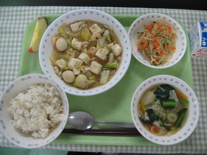 今日の給食は中華です。主食は麻婆豆腐丼です。豆腐を48kgも使い、作っています。豆腐は大豆からできており、大豆は畑の肉と呼ばれるほど良質なたんぱく質が含まれています。たんぱく質には体をつくるという働きがあります。また、免疫力アップという働きもあり、風邪やインフルエンザが流行っているこの時期にピッタリの食材でもあります。ぜひたっぷり麻婆豆腐をかけて、もりもり食べてくれたらと思います。