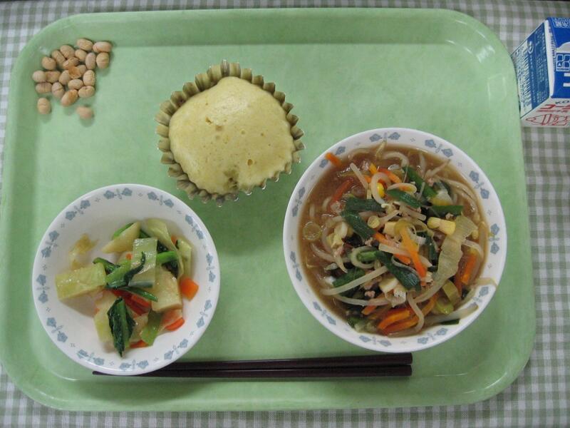 今日の給食は中華です。主食は味噌ラーメンです。給食のラーメンは具だくさんで、にんじん、もやし、豚肉、にら、きくらげ、長ネギ、コーンが入っていて、色々なうま味がでたスープとなっています。また、トウバンジャンが入っているので、ピリ辛で食欲誘うスープとなっています。