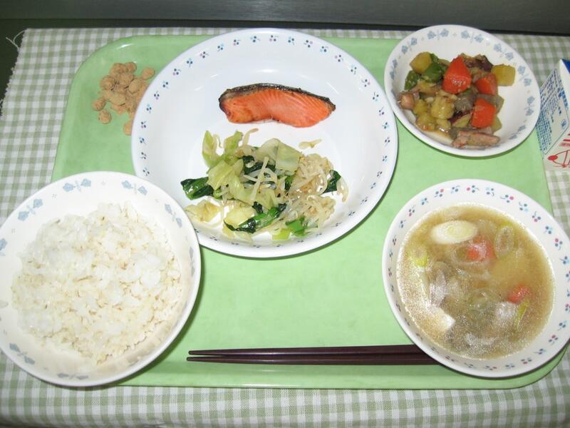 今日の献立は、和食です。主菜は鮭の照焼きです。鮭には、消化・吸収しやすいたんぱく質が豊富に含まれています。また、脳の活性化をするDHAなども含まれていて、テスト前に食べるのにぴったりのお魚です。今日の鮭は脂ののったとてもおいしい鮭なので、魚が苦手な人もぜひチャレンジしてくれたらと思います。