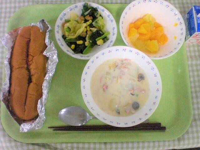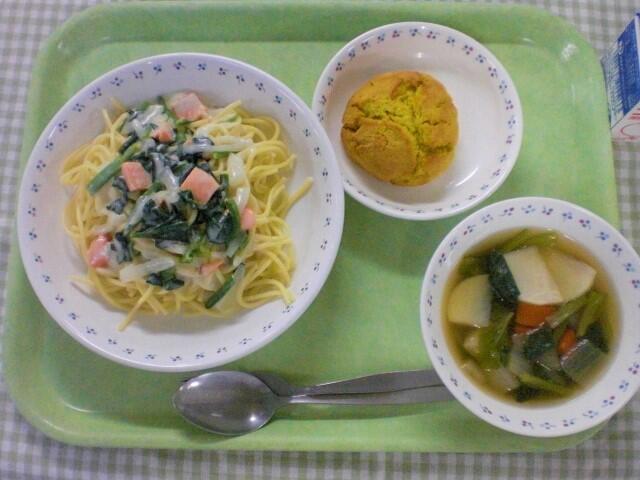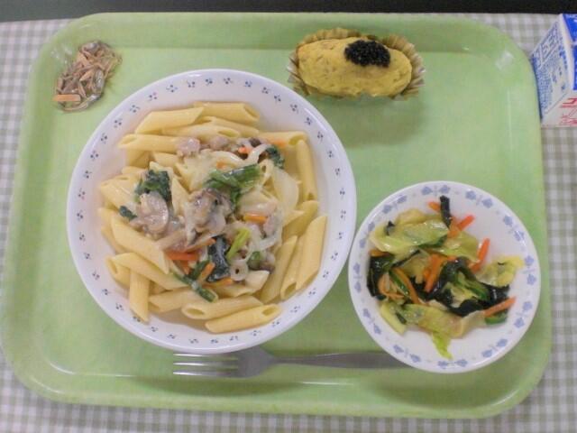 今日の給食は、洋食です。主食は、秋のクリームペンネです。何が秋かというと、旬なしめじがたっぷり入っていることです。手作りのルーやチーズ、生クリームを使っており、コクのあるホワイトソースになりました。ペンネとソースをしっかりよそって、旬なしめじを味わって食べてもらえたらと思います。
