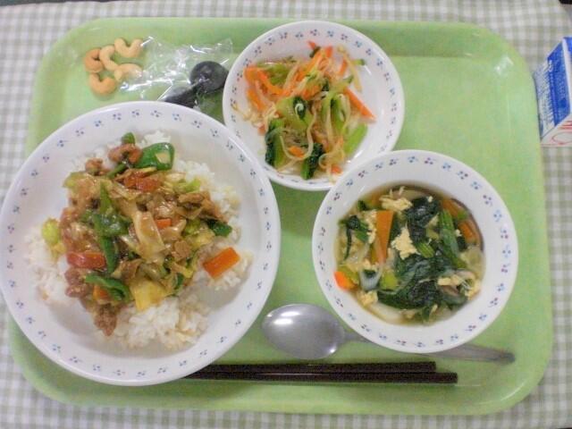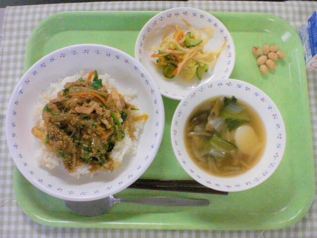 今日の給食は、中華です。主食は、豚バラ飯です。その名のとおり、豚バラ肉はもちろん、豚もも肉も加えて、お肉たっぷりで作りました。豚肉には、ビタミンB群が豊富に含まれており、エネルギー代謝を助けてくれたり、疲労回復をしてくれたりと栄養もあります。シンプルな料理ですが、豚肉のうま味が詰まっていて、仕上げにいりごまときざみのりをかけてより風味良く仕上げました。ぜひたくさん食べてもらえたらと思います。