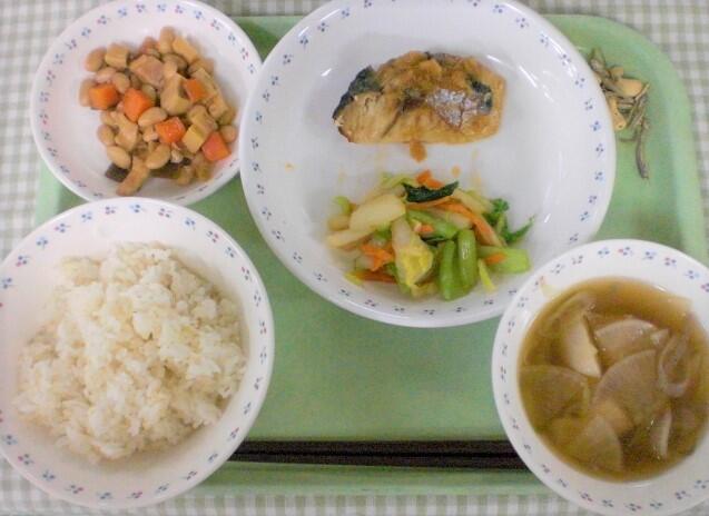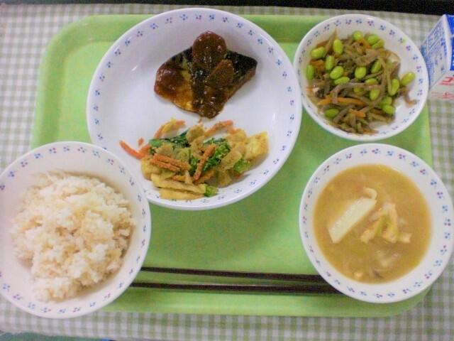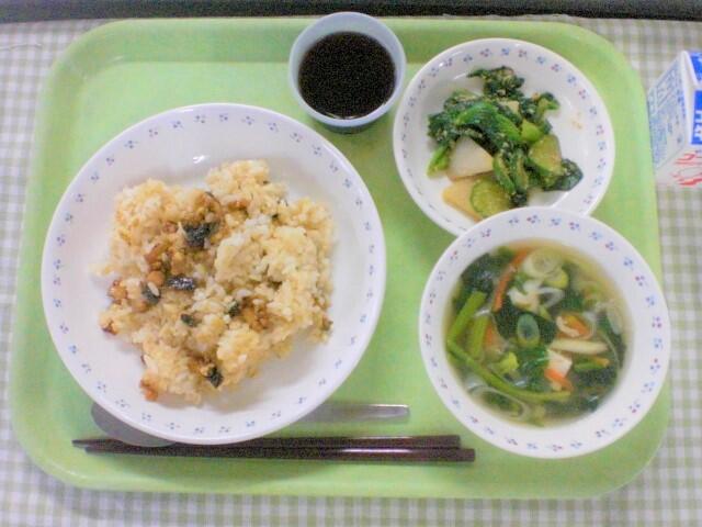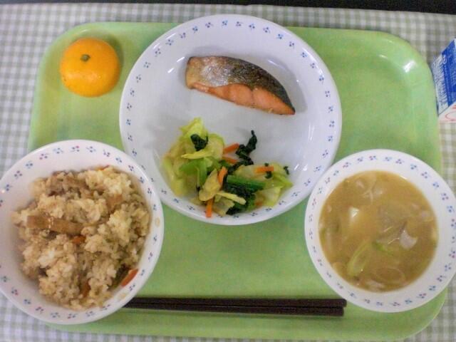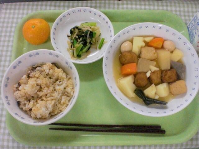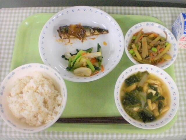 今日の献立は、和食です。主食は、きんぴら御飯です。ごぼう、にんじん、油揚げをしょうゆやみりん、酒、砂糖などを使って味をしみしみに煮込んでから、だし昆布や調味料と一緒に炊きこんだ御飯と和えました。具材の中でも、ごぼうには食物繊維が豊富に含まれています。食物繊維は、腸内環境を整え、善玉菌を増やしてくれます。美味しく、栄養もとれるので、ぜひしっかり食べてもらえたらと思います。