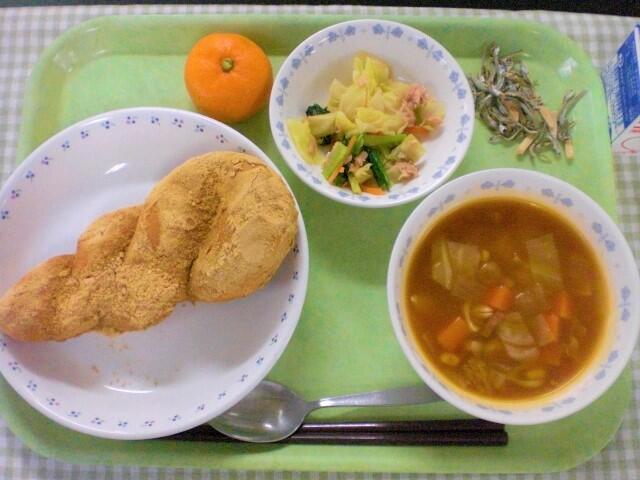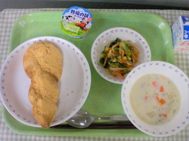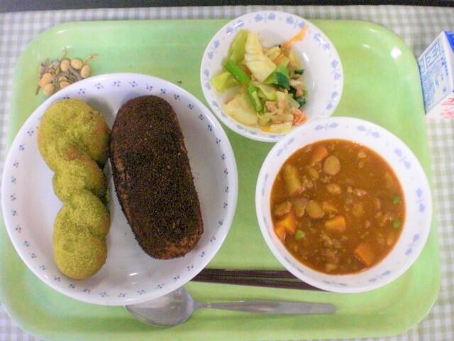 今日の献立は、洋食です。主食は、大人気メニューの揚げパンです。外はサクッと、中はふわっと絶妙に揚げたパンに、きなこ、砂糖、塩を合わせたものをたっぷりまぶしています。ただかけるだけでなく、1つ1つ裏表にしっかりつけるようにしてくれています。今日の揚げパンも美味しく出来たため、ぜひ残さず食べてもらえたらと思います。