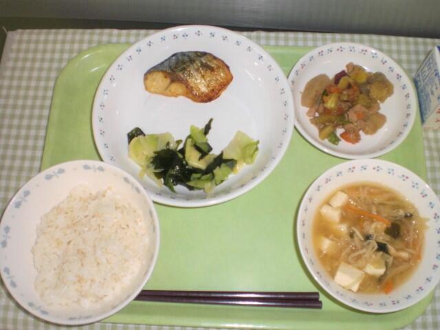 今日の献立は、和食です。主菜は、鯖のねぎみそ焼きです。脂ののった鯖をふっくらと焼き上げました。また、みそをベースとした調味料でねぎダレを作り、鯖にかけて仕上げています。鯖には、脳を活性化するDHAやカルシウムの吸収を助けるビタミンDなど様々な栄養が含まれています。ぜひご飯と一緒にしっかり食べてもらえたらと思います。