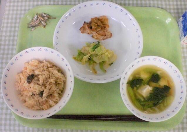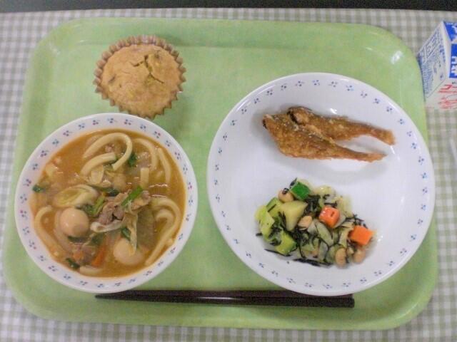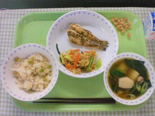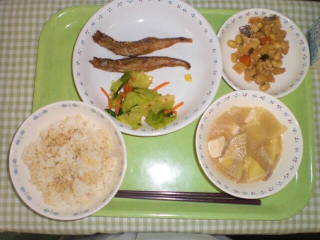 今日の献立は、和食です。主菜はししゃもの唐揚げです。まるっと食べられるししゃもには、カルシウムが豊富に含まれています。カルシウムは強い骨をつくるために、欠かせない大切な栄養素の1つです。また、青魚によく含まれている記憶力アップのDHA、筋肉など体をつくるたんぱく質なども豊富に含まれています。美味しく食べやすいように調理員さんが丁寧に揚げてくれたので、ぜひしっかり食べてくれたらと思います。
