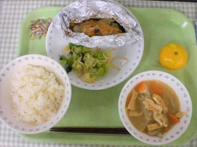 今日の献立は、和食です。主菜は鮭のホイル焼きです。旬の秋鮭を使って作っています。ホイル焼きにするには、みそダレを作り、鮭も下焼きし、それを合わせて1つ1つ手で包んでいきます。時間をかけて、調理員さんたちが丁寧に作ってくれたので、ぜひしっかり食べてくれたらと思います。