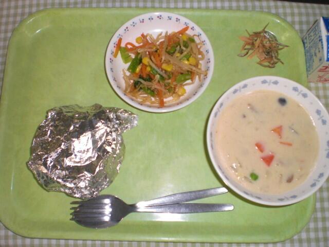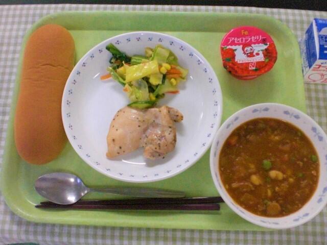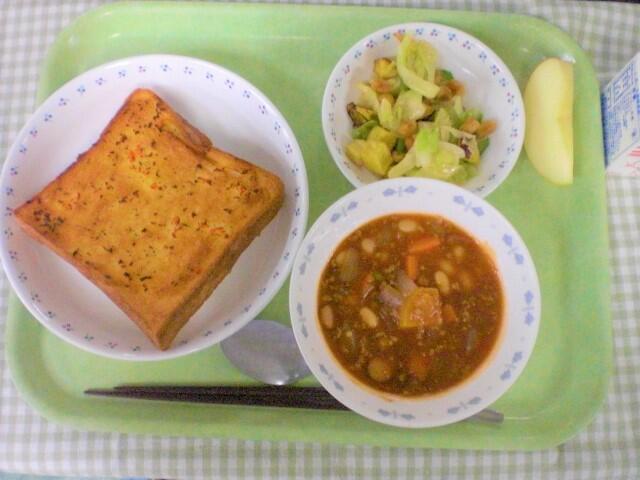 今日の献立は、洋食です。今日の汁物は定番のチリコンカンです。チリコンカンはアメリカの料理で国民食の1つでもあるそうです。今日のチリコンカンも具だくさんで、いんげん豆、豚肉、ウインナー、じゃがいも、玉ねぎ、にんじん、トマトが入っています。気温が下がり、少し寒いくらいになってきたので、ぜひ、温かく栄養満点のチリコンカンをもりもり食べてもらえたらと思います。