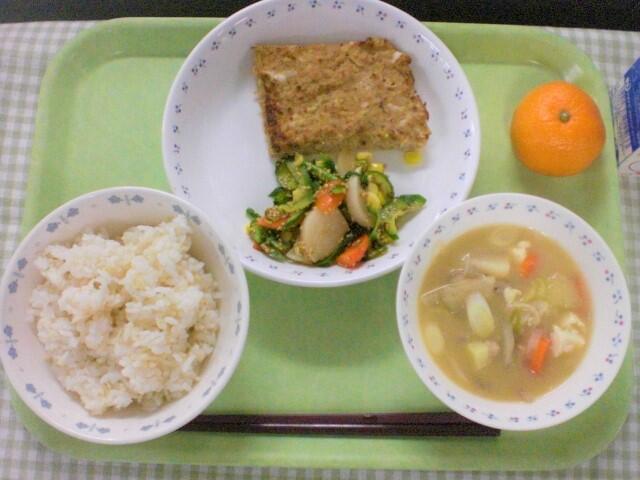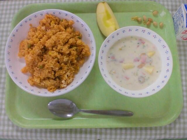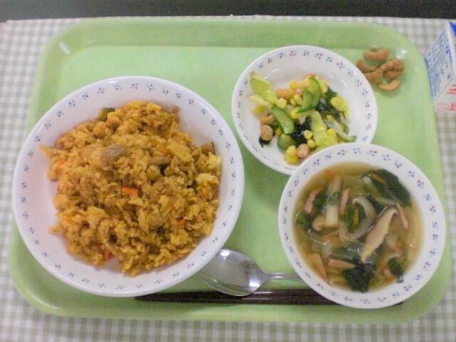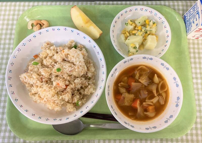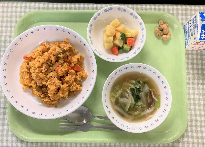 今日の献立は、洋食です。主食は、ナシゴレンです。ナシゴレンとは、インドネシア語で焼き飯を意味し、ナシが「飯」・ゴレンが「揚げる、油で炒める」という意味をもちます。今日のナシゴレンは、えび、鶏肉、玉葱、赤ピーマン、青ピーマン、にんにくが具材として入っています。えびには、体をつくるたんぱく質が豊富です。また、タウリンという疲労回復効果のある栄養素等も含まれており、栄養がある食材です。美味しく仕上がったので、ぜひもりもり食べてもらえたらと思います。