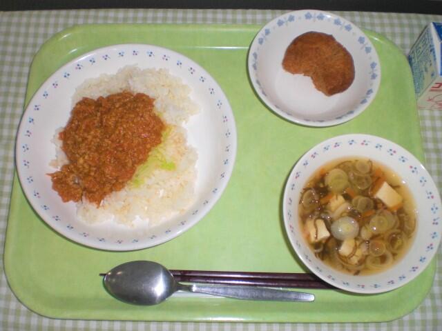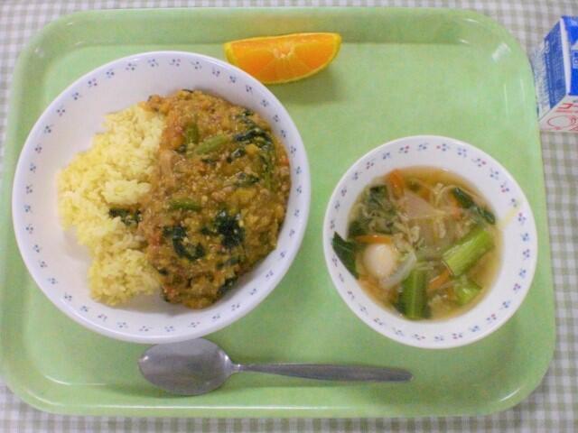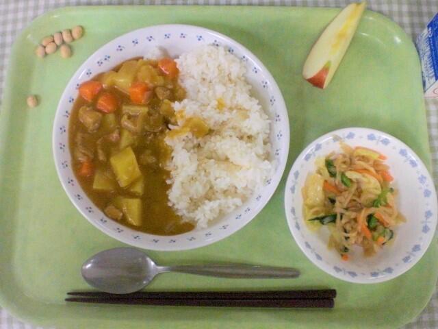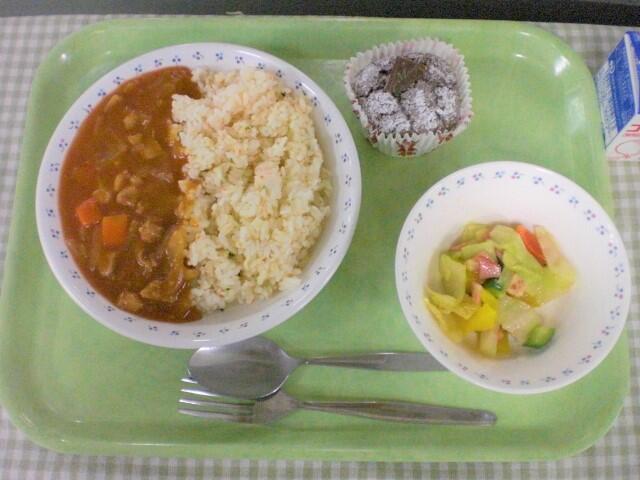 今日の主食は、大人気のカレーです。今日は、チキンカレーではなく、豚肉を使ったポークカレーにしています。チキンとポークの違いは調理方法です。チキンは最初にしょうが、にんにくと一緒に炒めて使いますが、ポークは表面を炒めてから、ワインやスパイスを加えただし汁でことことやわらかくなるまで、よく煮込みます。使うお肉、作り方で、同じ美味しいカレーでも味は異なります。今日のカレーも美味しくできたので、ご飯もルーもたっぷりよそって食べてもらえたらと思います。