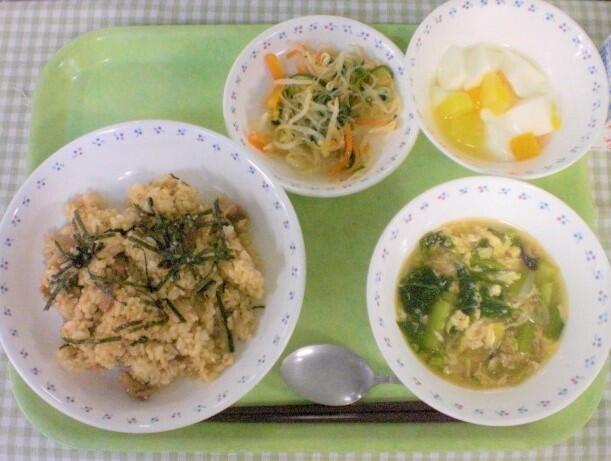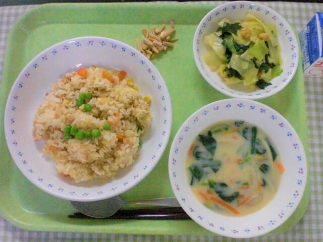 今日の献立は、洋食です。主食は、ツナライスです。ツナはまぐろやかつおなどの魚から作られています。そのため、体をつくる、たんぱく質が豊富に含まれています。ツナ以外んも、にんじん、玉ねぎ、グリンピースを加えて粉チーズもたっぷり加えて仕上げました。食べやすいご飯のため、ぜひもりもり食べてもらえたらと思います。