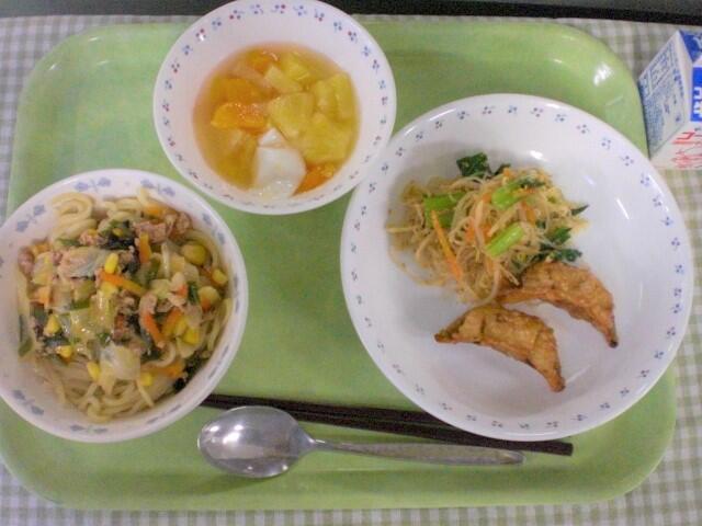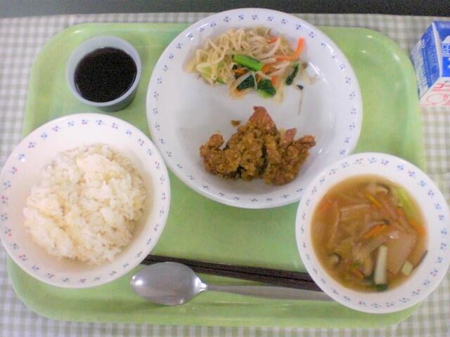 今日の献立は、中華です。主食は、揚げ麺の五目あんかけです。パリパリ麺は市販のものではなく、朝9時半頃から2時間程度時間をかけて全校生徒分、調理員さんが揚げてくれました。そして、五目あんは、豚肉、にんじん、玉ねぎ、白菜、小松菜、たけのこ、うずらの卵、しいたけとたくさんの具材が入っています。食材の食感を残すように、丁寧に仕上げてくれたあんと食べてももちろん美味しいですし、麺だけでもパリパリしていて美味しいです。調理員さんが手間暇かけて作ってくれたので、ぜひたくさん食べてもらえたらと思います。