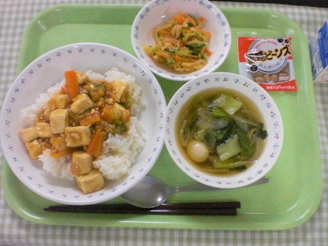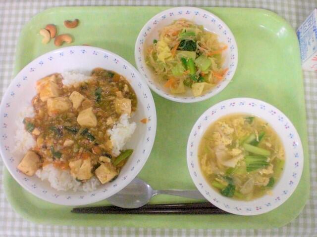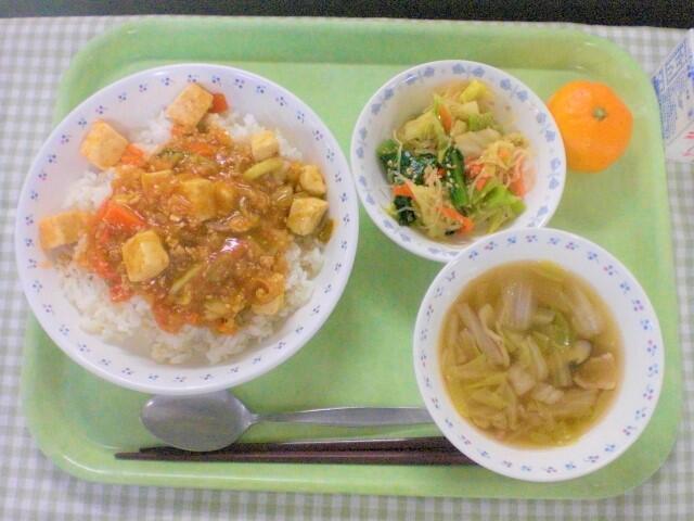 今日の献立は、中華です。主食は、麻婆豆腐丼です。今日の麻婆豆腐もお豆腐屋さんのお豆腐をたっぷり使って作りました。豆腐には、たんぱく質が豊富に含まれています。そんな豆腐を今日は56キロも使って麻婆豆腐を作りました。また、みじん切りになっていますが、ねぎ、にんじん、しいたけやにらなど野菜もたっぷり使っています。ぜひご飯と一緒にもりもり食べてほしいです。