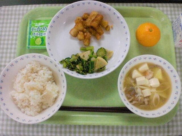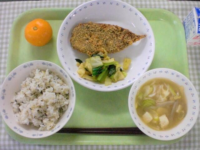 さて、今日の献立は、和食です。主菜は、はたはたの唐揚げです。はたはたには、体を作るたんぱく質や記憶力や視力アップ等の効果があるDHAなどが含まれています。また、一匹まるっと骨まで食べられるため、骨や歯を作るカルシウムもとることができます。そんな栄養があるはたはたを、調理員さんがサックリ揚げてくれて、とても食べやすくなっています。塩気のあるわかめご飯にも合うので、一緒にしっかり食べてもらえたらと思います。