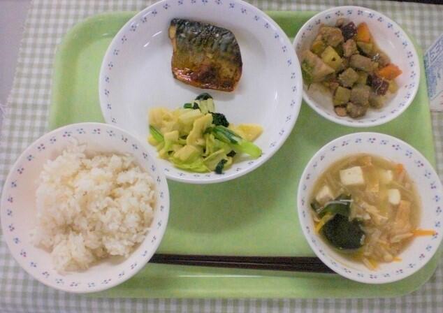 さて、今日の献立は、和食です。主菜は、鯖の味噌煮です。脂ののった美味しい鯖を味噌屋さんの味噌やねぎ、しょうがと一緒にことこと約2時間煮込むことで、味がしみしみのほろほろに仕上がりました。鯖には体をつくるたんぱく質や記憶力アップのDHA、貧血予防にもなる鉄分など様々な栄養素が含まれています。味がしっかりしていて、ご飯と相性ピッタリなので、ご飯も、もりもり食べてもらえたらと思います。