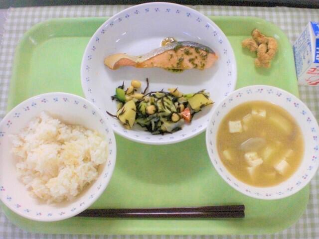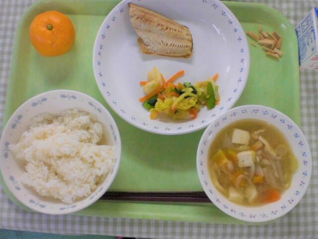 今日の給食は和食です。主菜は鯖の文化干しです。文化干しは、1950年頃、魚の干物をセロファンで包み売ったことを最先端で、文化的だと言ったことが由来だそうです。今では、冷風乾燥機で作られたもの全般を言います。脂ののった鯖を文化干しにすることで、水分が減り、旨味がグッと濃縮されます。ぜひ鯖の旨味を感じられる文化干しをご飯と一緒にしっかり食べてもらえたらと思います。