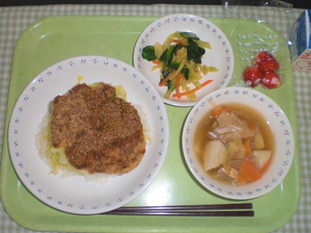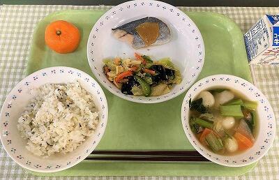 今日の給食は、和食です。今日の汁物はすいとんです。すいとんは室町時代からあったとされ、江戸時代にはすいとん専門店があったほどの人気料理だったそうです。今日は、小麦粉、白玉粉を合わせ、よく練って、調理員さんが1つ1つちぎってくれて作りました。すいとん以外にも具だくさんで、栄養たっぷりです。