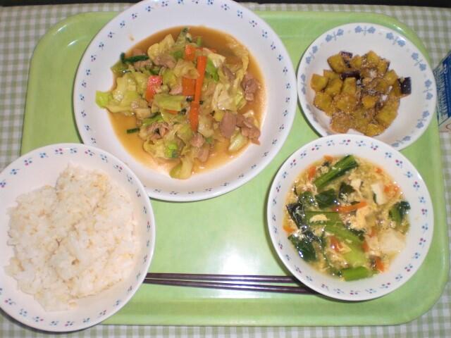 今日の献立は、中華です。主食は、ホイコーロー丼です。ホイコーロー丼の美味しさの秘訣はやはり味です。しょうゆ、テンメンジャン、砂糖、オイスターソース、トウバンジャンと色々な調味料を合わせることで、旨味やコクがでています。また、タレが良くからみ、かつ食感よく仕上がるように具材は少し大きめに切っています。美味しい新米をたっぷりよそり、具材もたっぷりよそって、ぜひもりもり食べてもらえたらと思います。