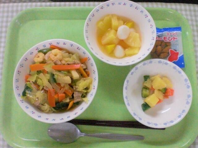 今日の献立は、中華です。主食は、五目炒飯です。「五目」という意味は、色々なものが入り混じっていること、という意味で使われています。今日の五目炒飯は、長ネギ、豚肉、にんじん、しいたけ、グリンピースが入っています。中でも長ネギは柏の特産物であり、今日のねぎも柏市布施産のものです。美味しくできたので、もりもり食べてくれたらと思います。