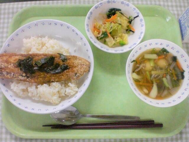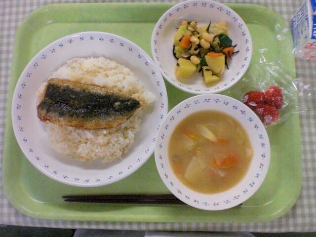 今日の献立は、和食です。主菜は、鯖のピリ辛焼きです。柏産のねぎ使って、ねぎダレを作りました。ねぎには、体温を高めて血行を促進させる作用があるといわれています。また、ねぎの白い部分には、ネギオールという殺菌作用のある栄養素などもあります。ぜひ脳を活性化するDHAがたっぷりな鯖と合わせてねぎダレもしっかり食べてほしいです。