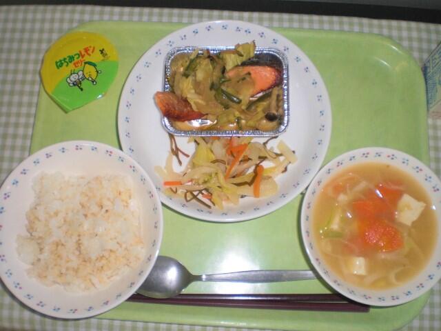 今日の献立は、和食です。主菜は、鮭の味噌漬け焼きです。今日の鮭は、キングサーモンという種類です。脂がよくのっており、かつ肉厚なので、魚ですが、まるでお肉のように食べやすいです。そんなキングサーモンに、にんにく・ねぎをよく炒め、みそ屋さんの美味しいみそをベースに作ったみそダレをかけて仕上げました。ぜひしっかり食べてもらえたらと思います。