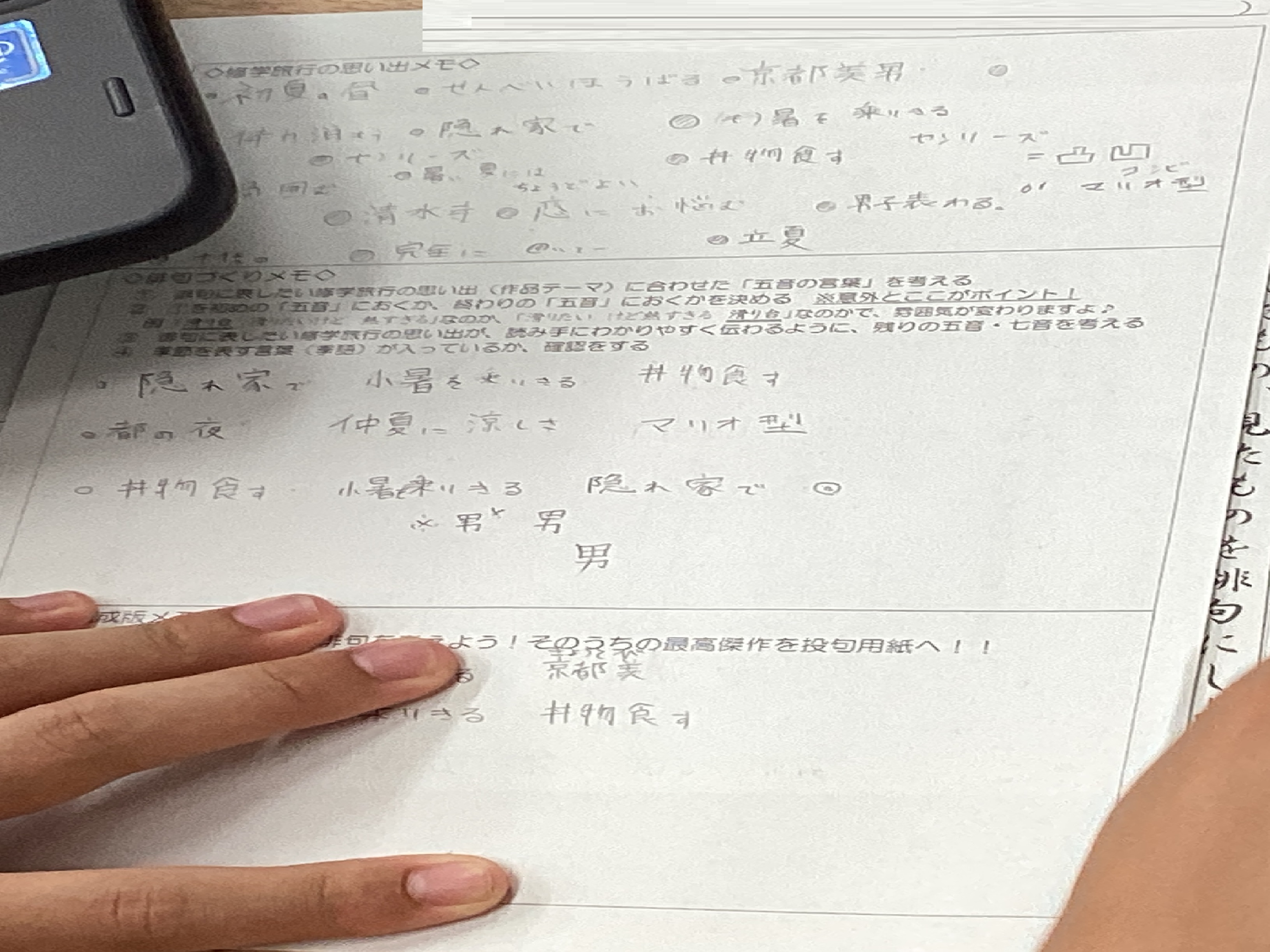 班別学習を終え、集合してきました。班ごとにチェックを受けて、スマホを回収します。体調不良もなく、みなさん元気です。