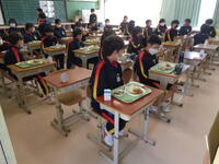 食器や食管を丁寧に並べ、慎重に配膳する当番たち。教室の中も整然としていました。素晴らしい秩序です!