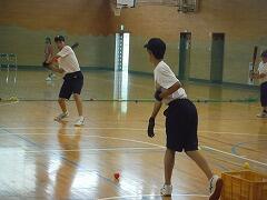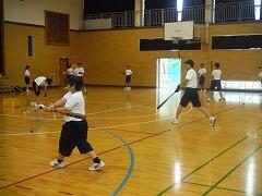 次は野球部の練習です。前日の雨でグラウンドが使えないので、室内でも使えるカラーボールを使って、体育館でバッティング練習練習をしています。
