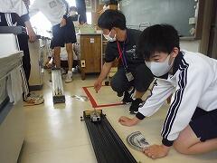 班ごとにわかれて、台車を使い坂道での運動の実験を行いました。