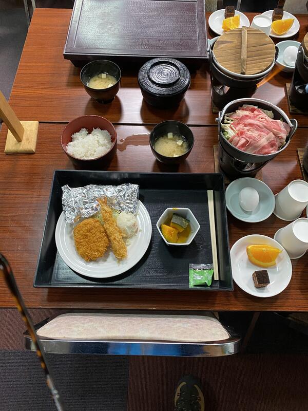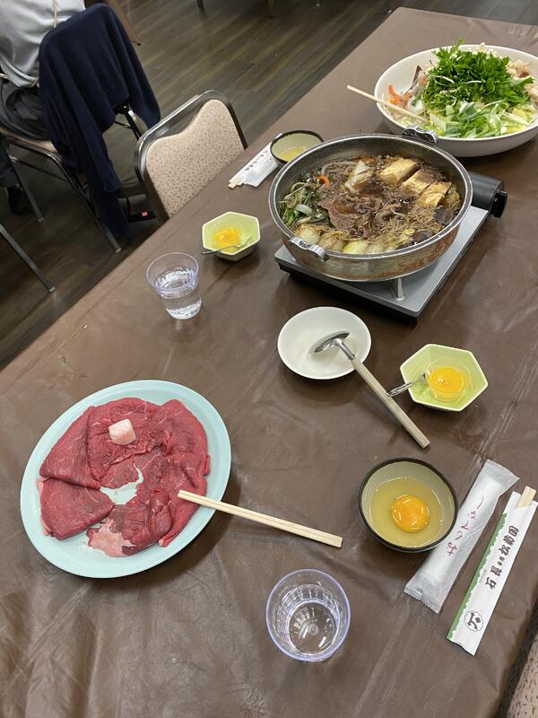 今日の夕食は修学旅行の定番、すき焼きでした。