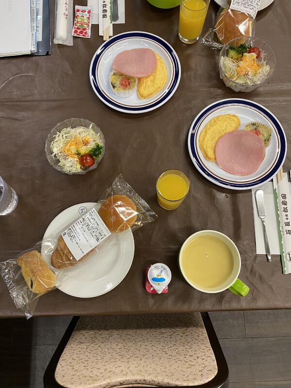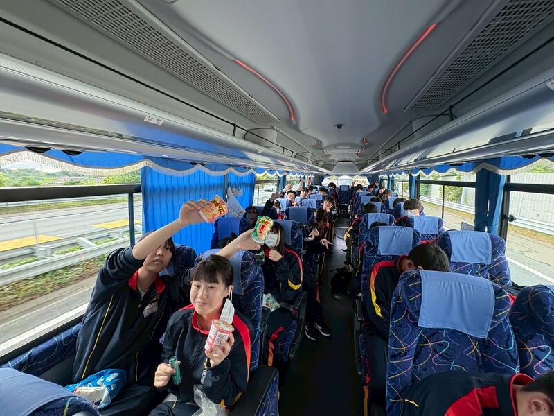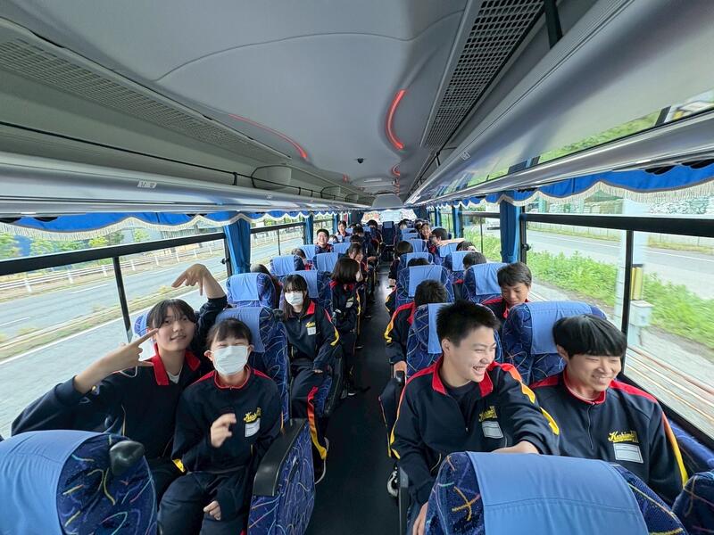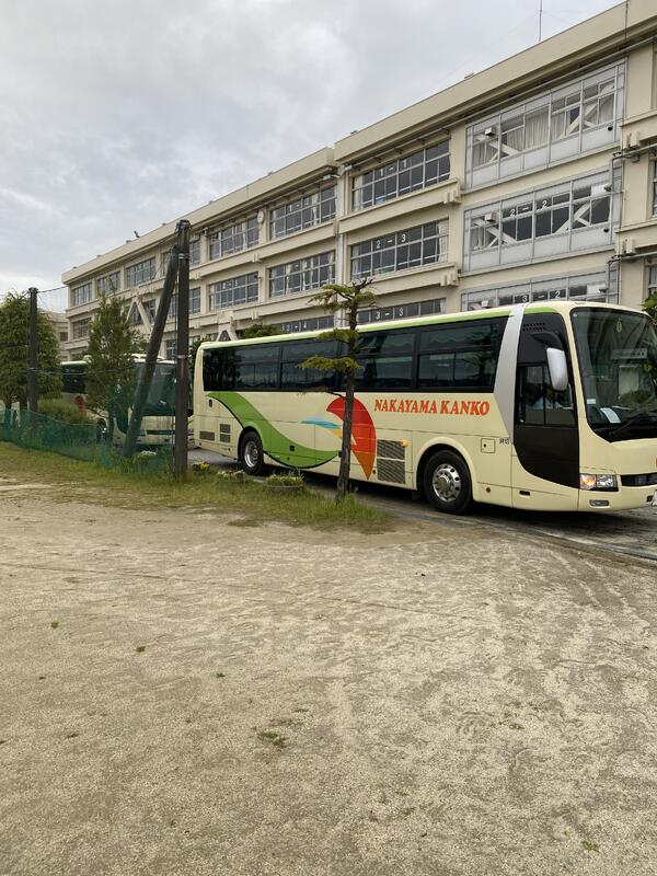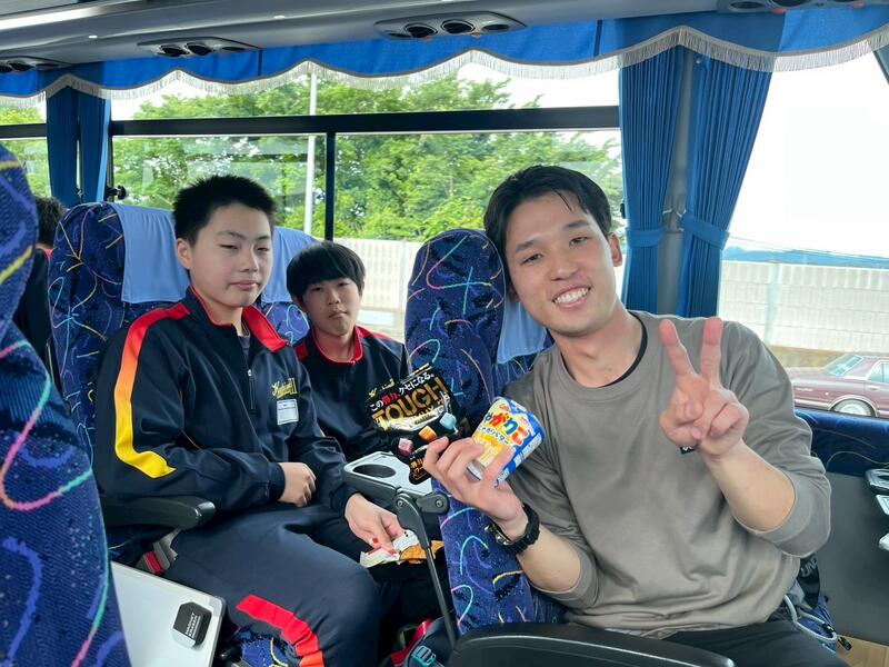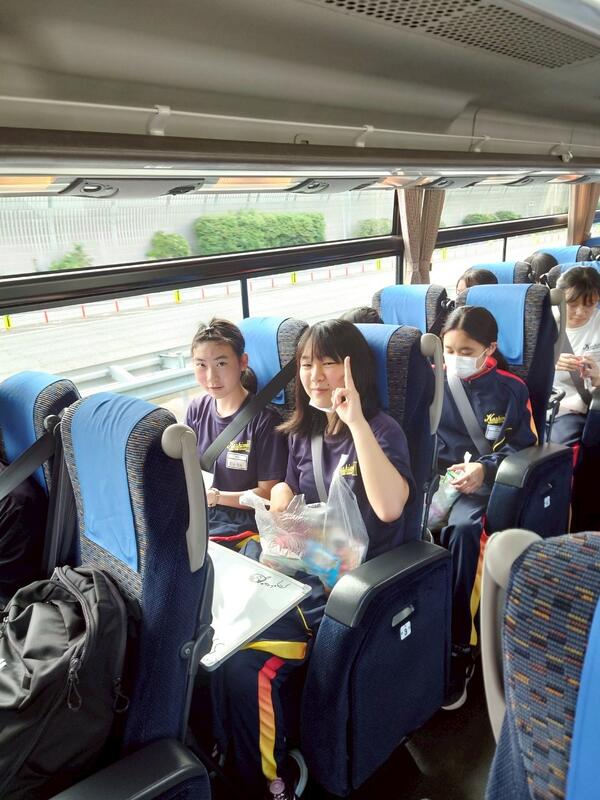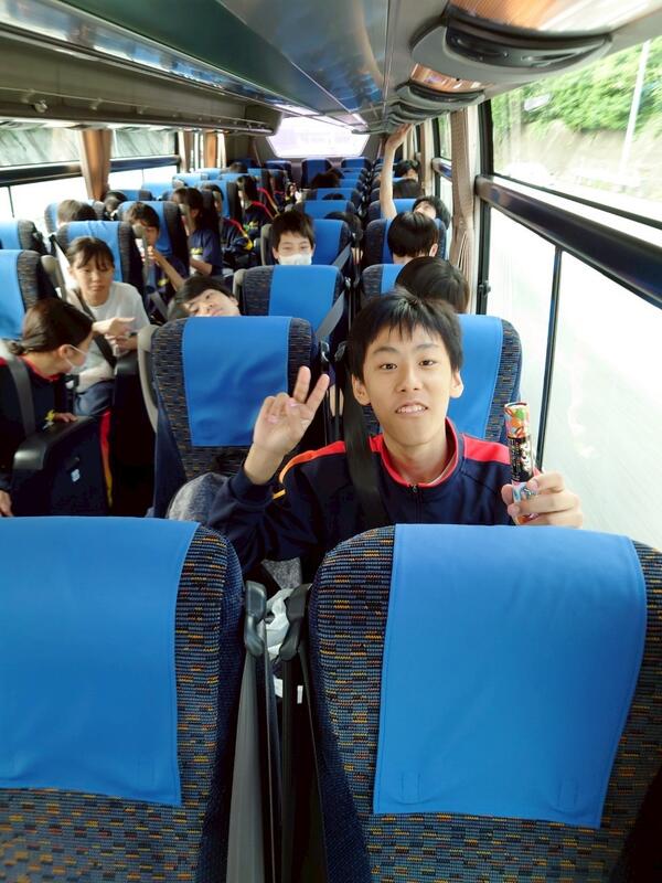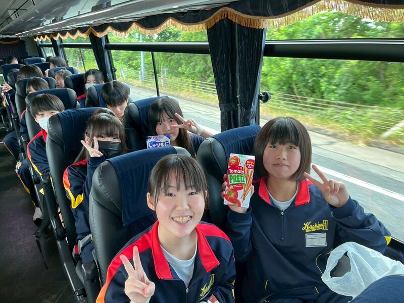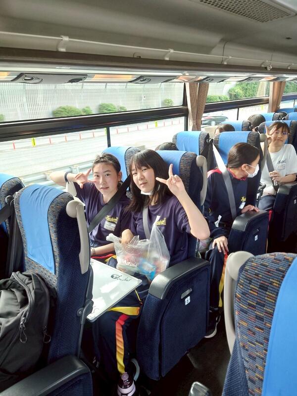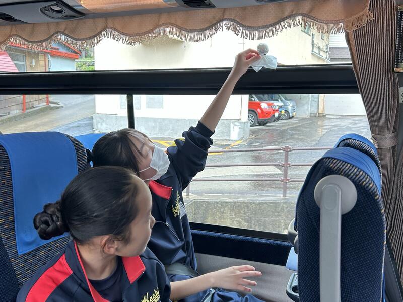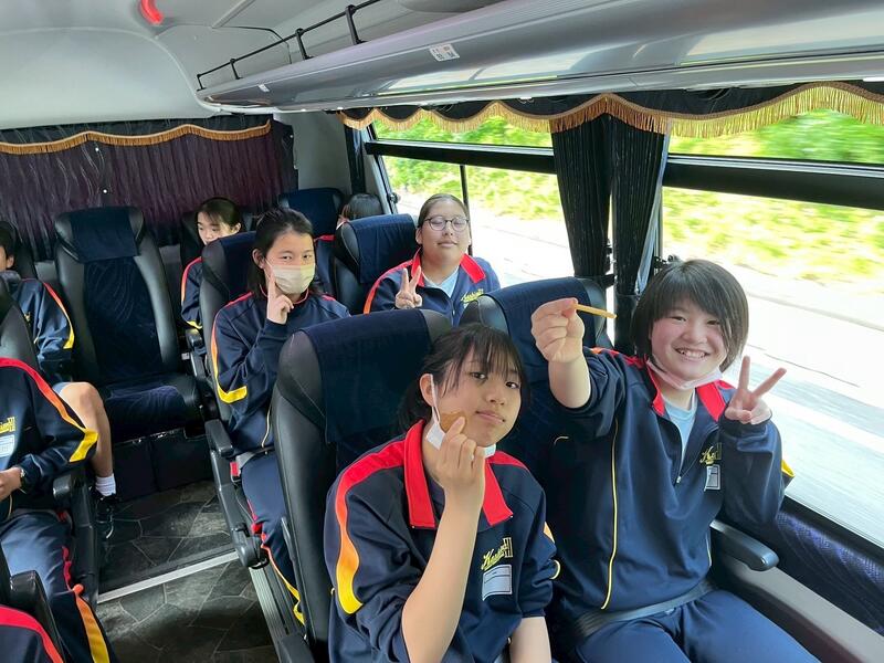 三芳パーキングエリアを出発し、おやつタイムがはじまりました。1組では、食事係のSさんの爆笑謝罪会見とその後のクレーム対応受付の連絡から楽しくおやつを食べています。