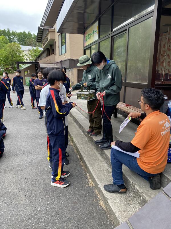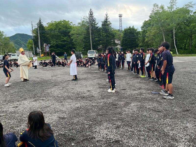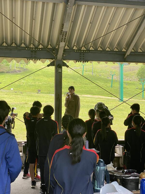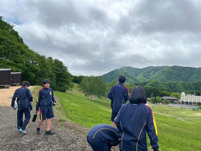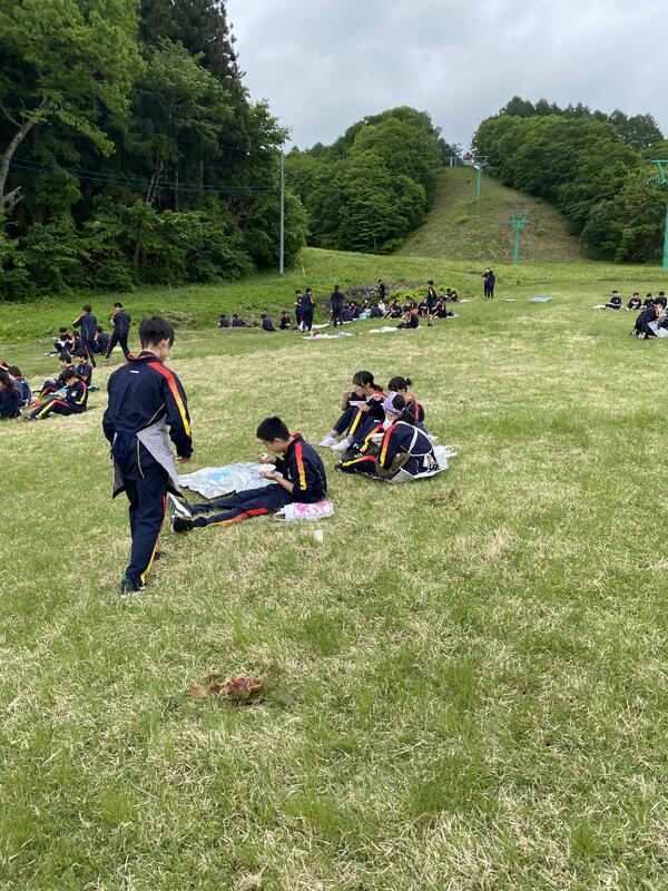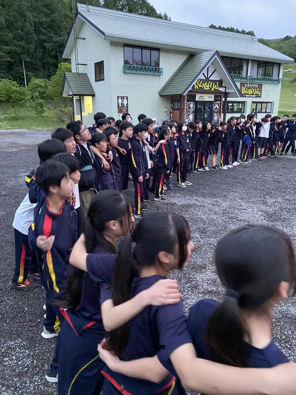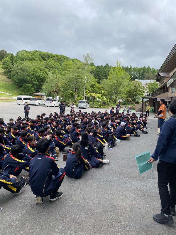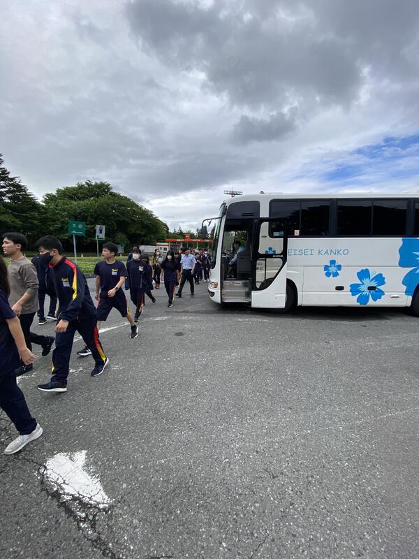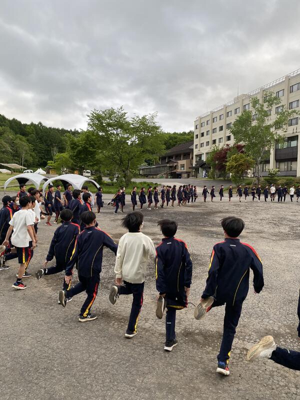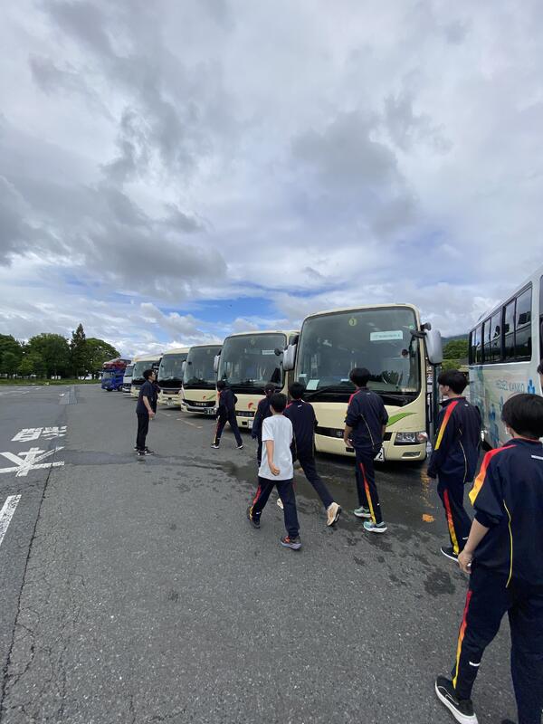 2年生は本日から1泊2日で、林間学校を実施します。群馬県沼田市で、飯盒炊爨、オリエンテーリング、キャンプファイヤー、ラフディング体験と、自然体験満載のプログラムです。前日まで雨が心配でしたが、雨も上がり天気はもちそうです。グランドがぬかるんでいるので、体育館で出発式を行ってバスに乗り込みます。