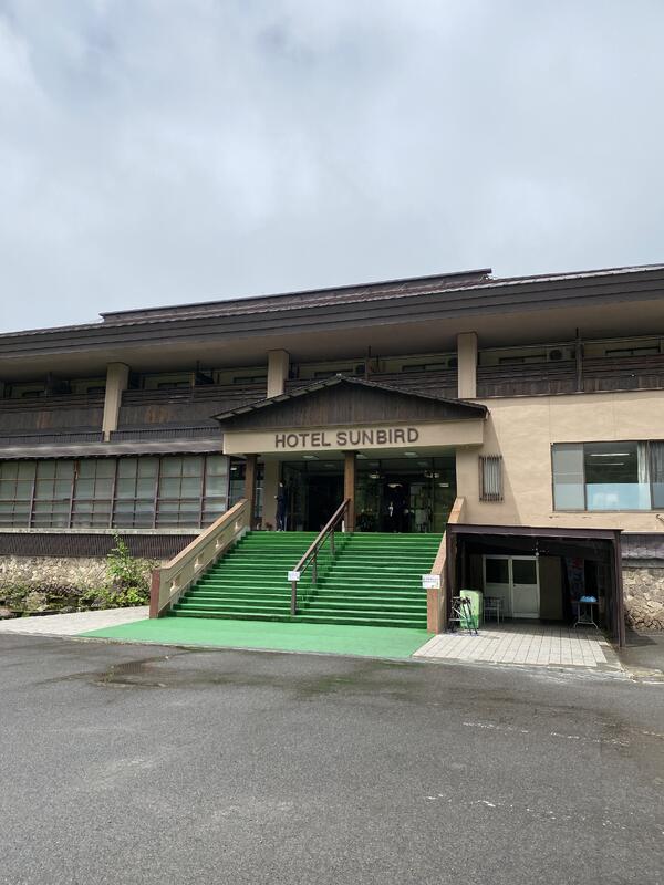 ホテルサンバードに到着しました。てるてる坊主が効いたのか、雨も上がりました。このあと、飯盒炊爨でカレーライスをつくります。