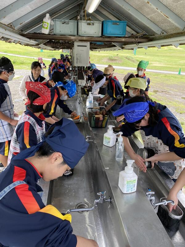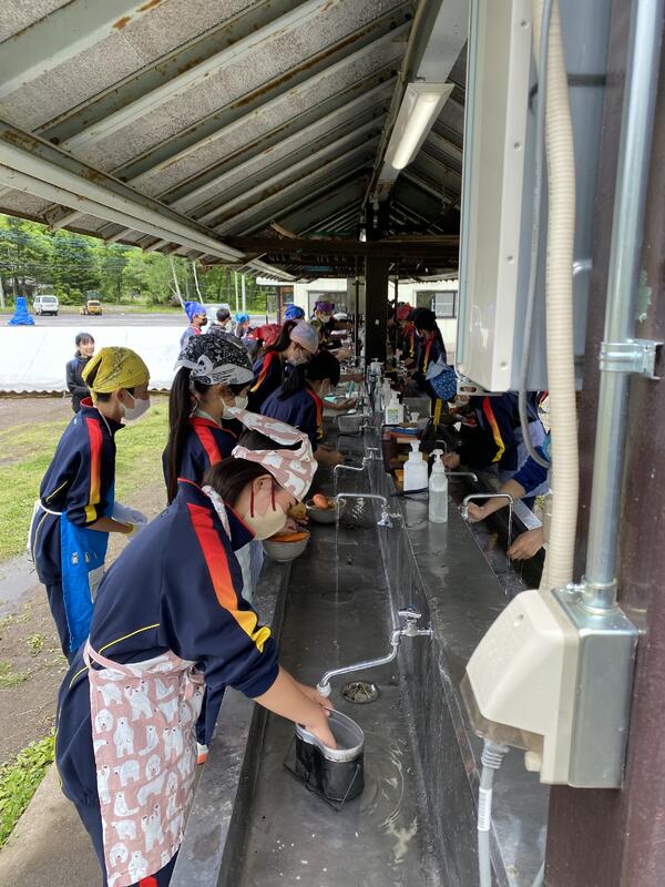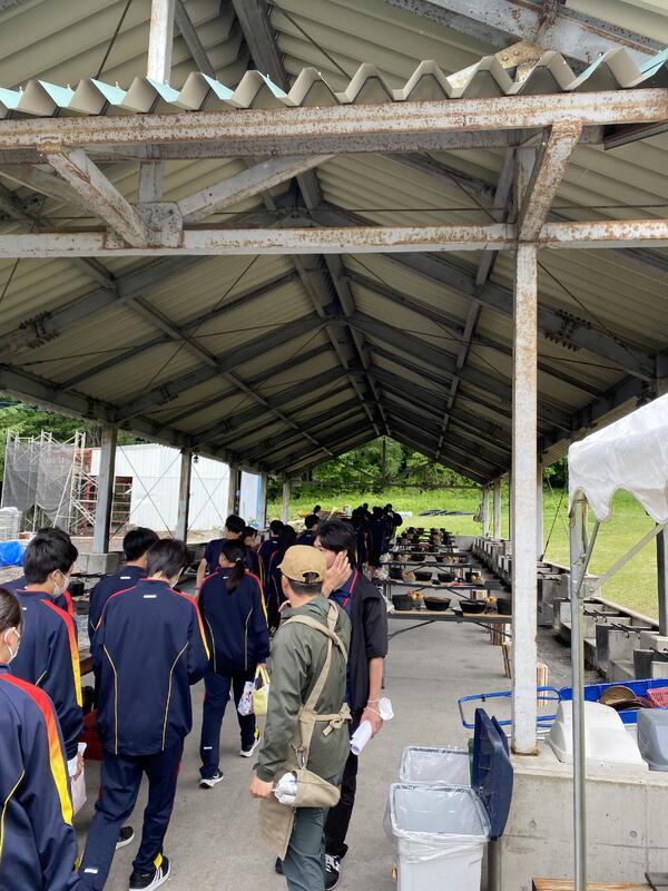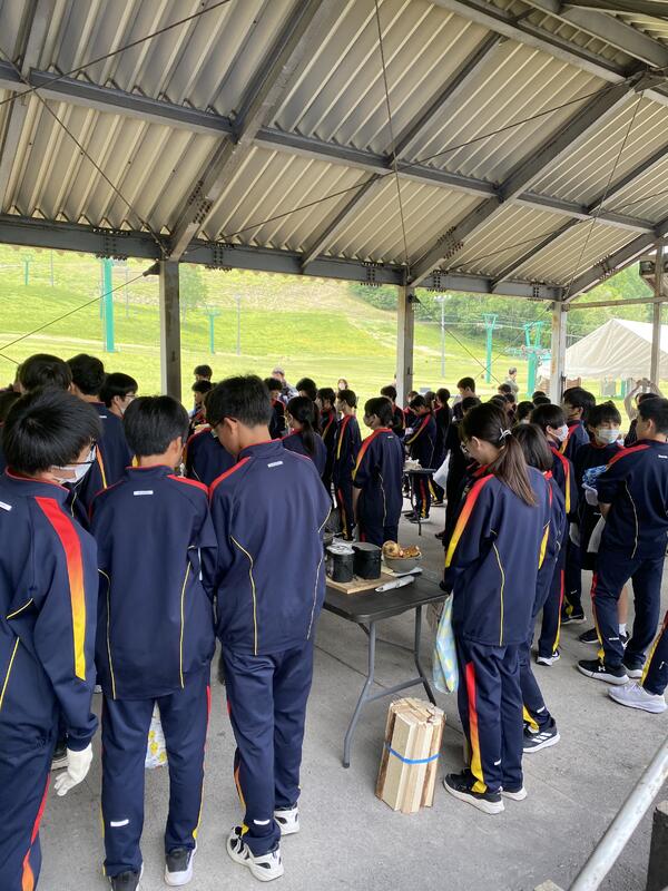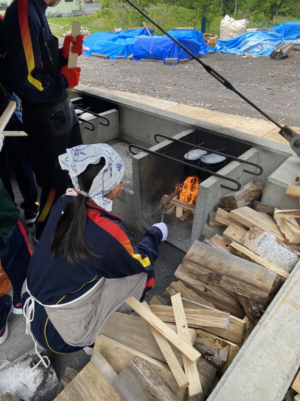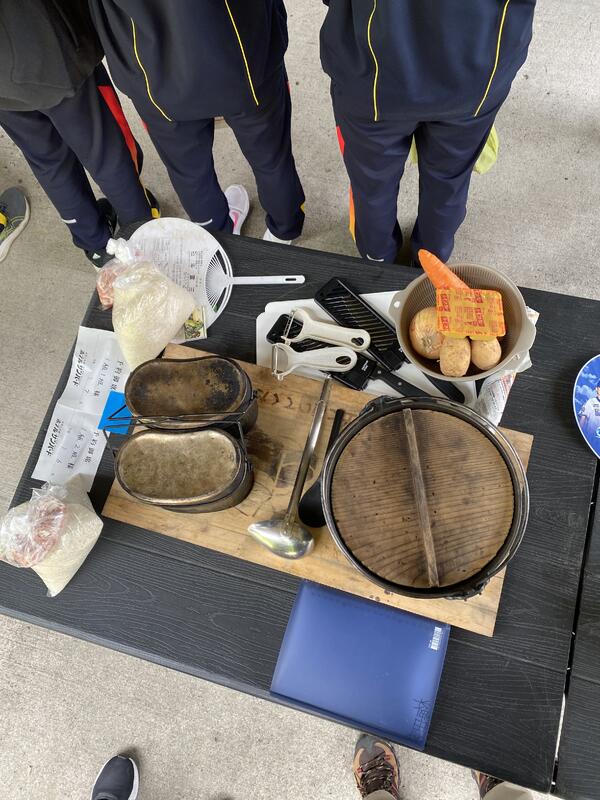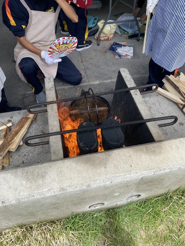 晴れ間がのぞいてきました。飯盒炊爨始まりました。飯盒でお米を研ぐ係、野菜と肉を切る係、薪を焚べて火を起こす係に分かれて準備が始まりました。
