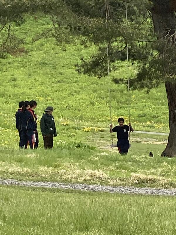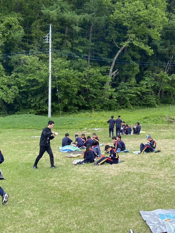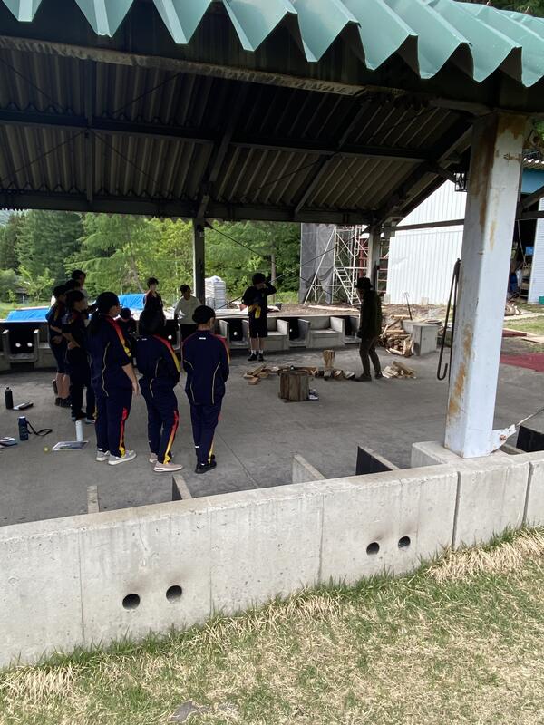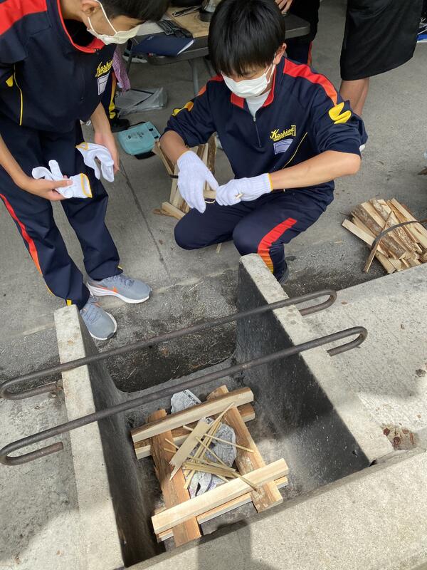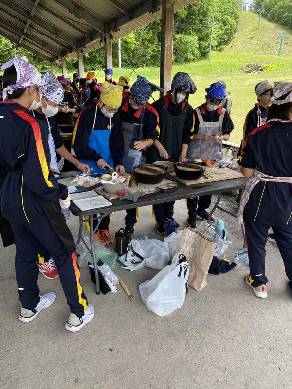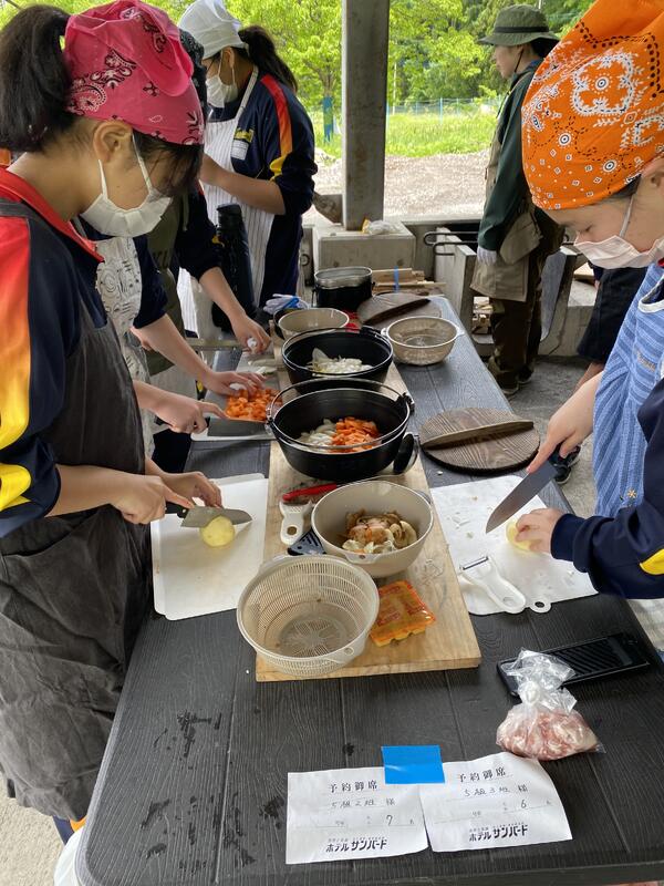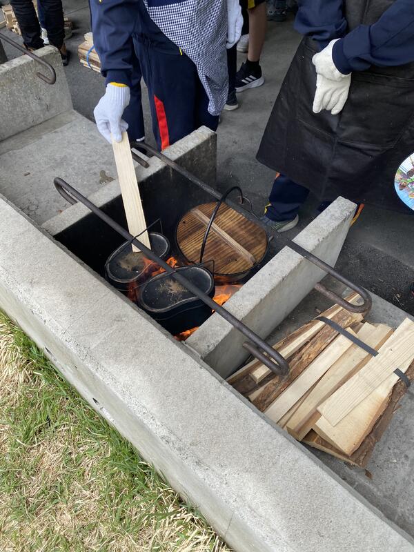 晴れ間がのぞいてきました。飯盒炊爨始まりました。飯盒でお米を研ぐ係、野菜と肉を切る係、薪を焚べて火を起こす係に分かれて準備が始まりました。
